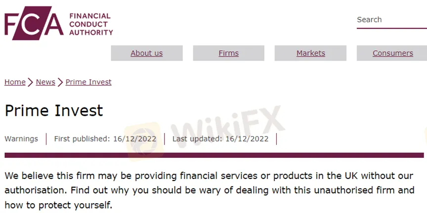 外匯天眼警報:FCA針對Prime Invest發出警告