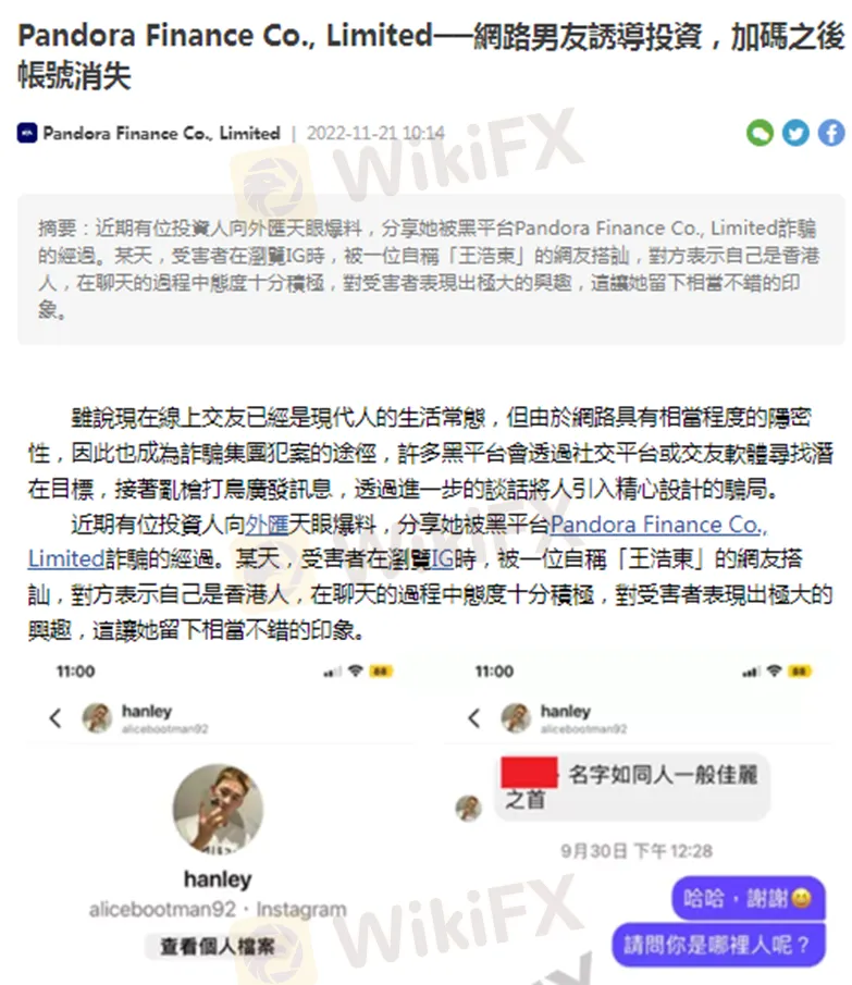 其中評分1.61的Pandora Finance也在1月中遭到爆料,這位受害者同樣是在IG上認識了一位男網友,也是被鼓吹做外匯投資,之後想領錢一直無法成功,整個過程與手法如出一轍,顯然是同個詐騙集團的套路。